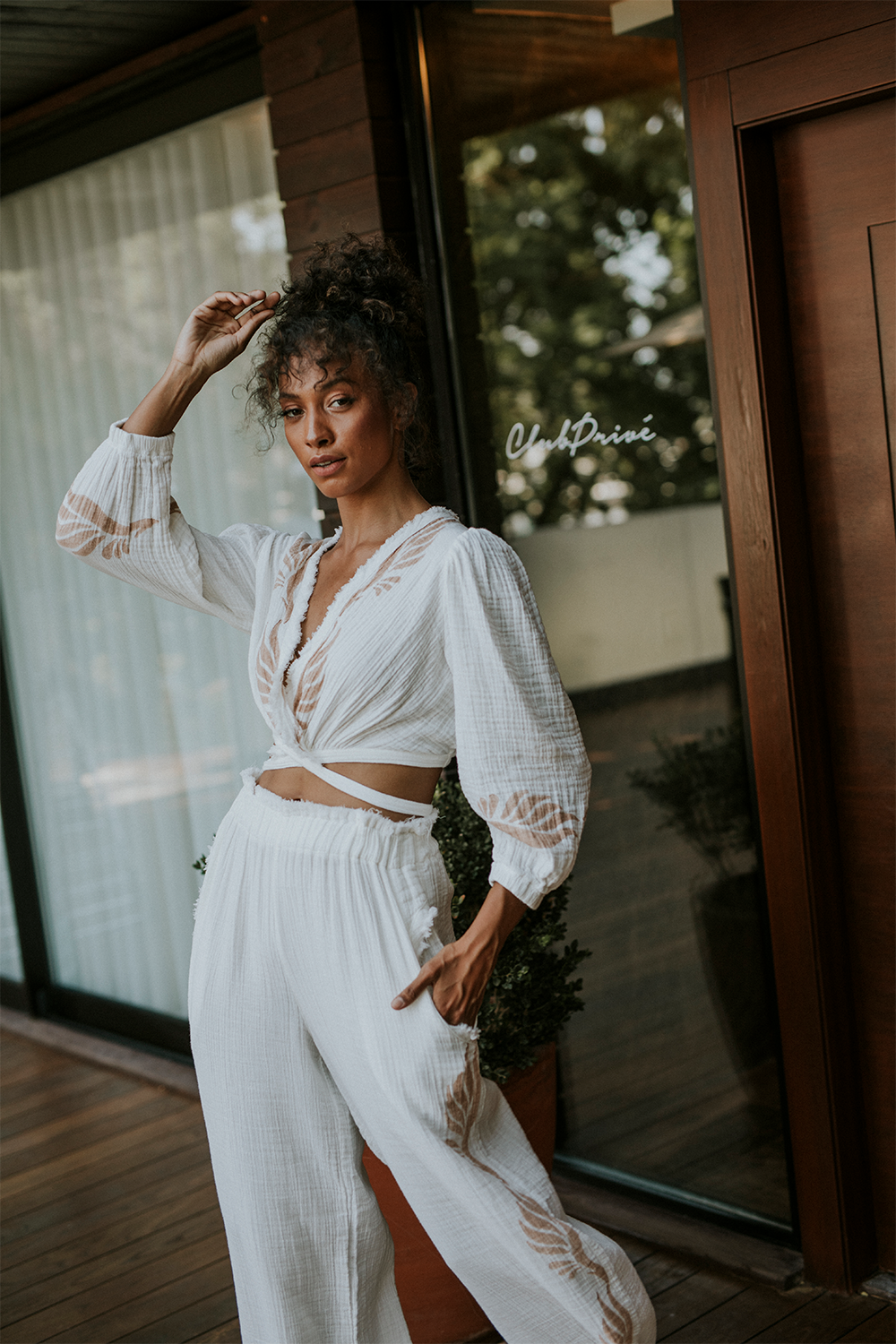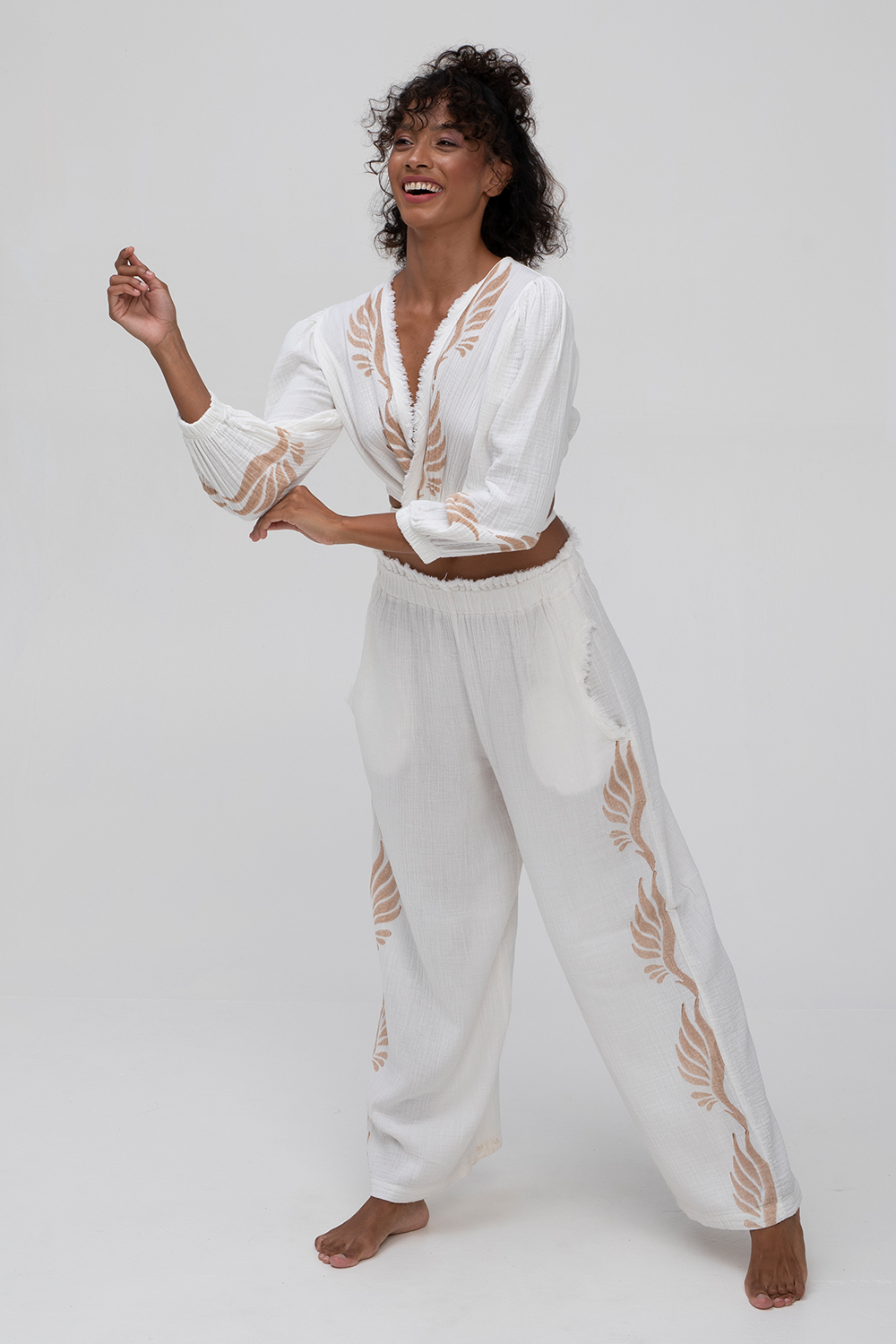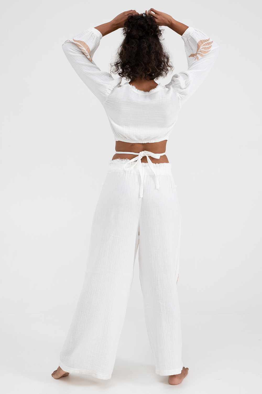 Pamuklu Kahve Ağaç Baskılı Beyaz Geniş Paça Pantolon