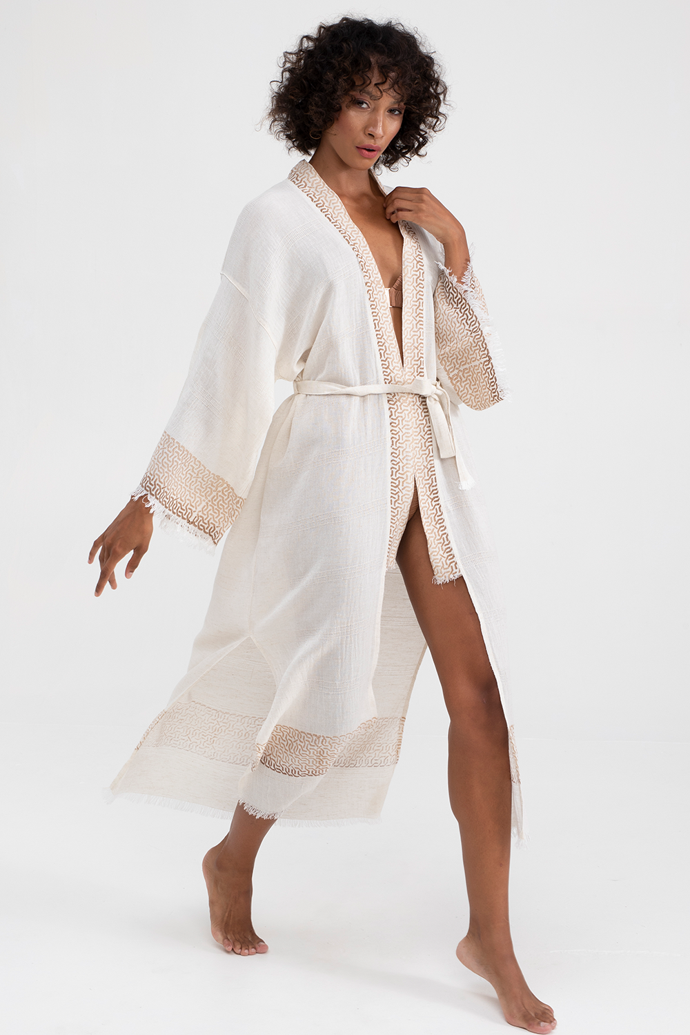 Kahve Ağaç Baskılı Keten Uzun Kimono